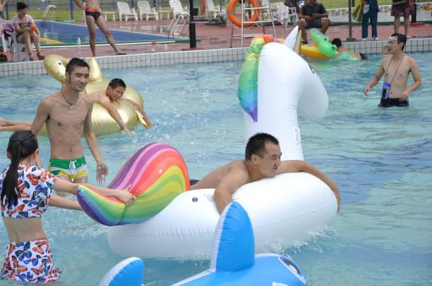 隨后,水上趣味接力賽拉開(kāi)了帷幕。選手們趴在造型各異的動(dòng)物氣墊上從水上滑梯沖入水中,濺起陣陣?yán)嘶?,然后奮力將氣墊劃向下一個(gè)選手處。把氣墊當(dāng)成小船往前劃非常費(fèi)力,選手們嘗試了各種方法,有用手劃水的,有用腳蹬的,還有手腳并用的,有的還一不小心掉進(jìn)了水里,水池邊的圍觀啦啦隊(duì)們又一次忍俊不禁的開(kāi)懷大笑。